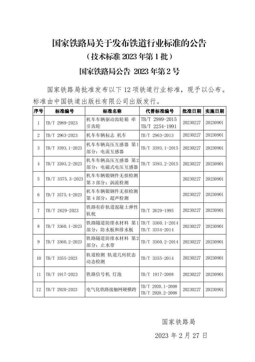 國家鐵路局關(guān)于發(fā)布鐵道行業(yè)標(biāo)準(zhǔn)的公告(技術(shù)標(biāo)準(zhǔn)2023年第1批)